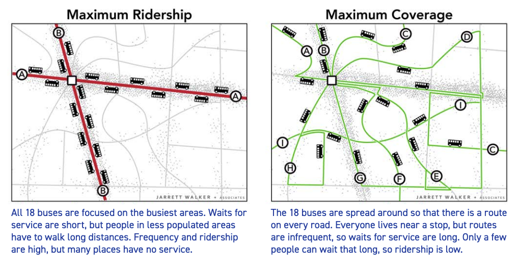 Designing a bus network always involves trade-offs. One of the biggest is between ridership and coverage — and every transit agency must choose how to balance the two.